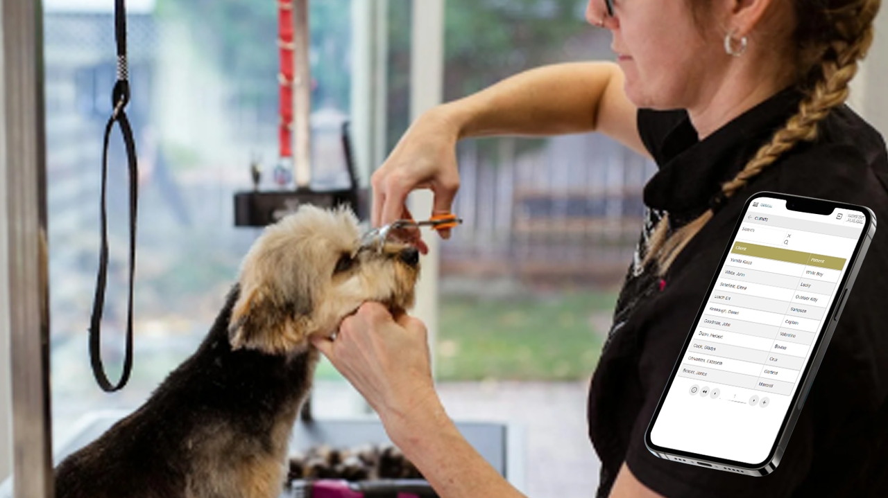 Software de cuidado móvil para peluqueros de mascotas en movimiento.